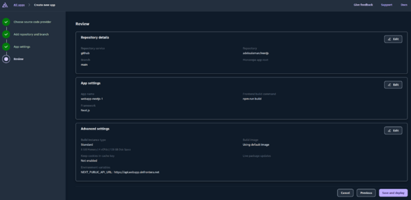 - Connection > Connect to GitHub: Here we need to make sure we click on "Install a new GitHub app". If we don't do this, the pipeline code won't be automatically updated when we push changes to our GitHub repository. I think is good practice to use "adeloaleman@gmail.com" as connection name