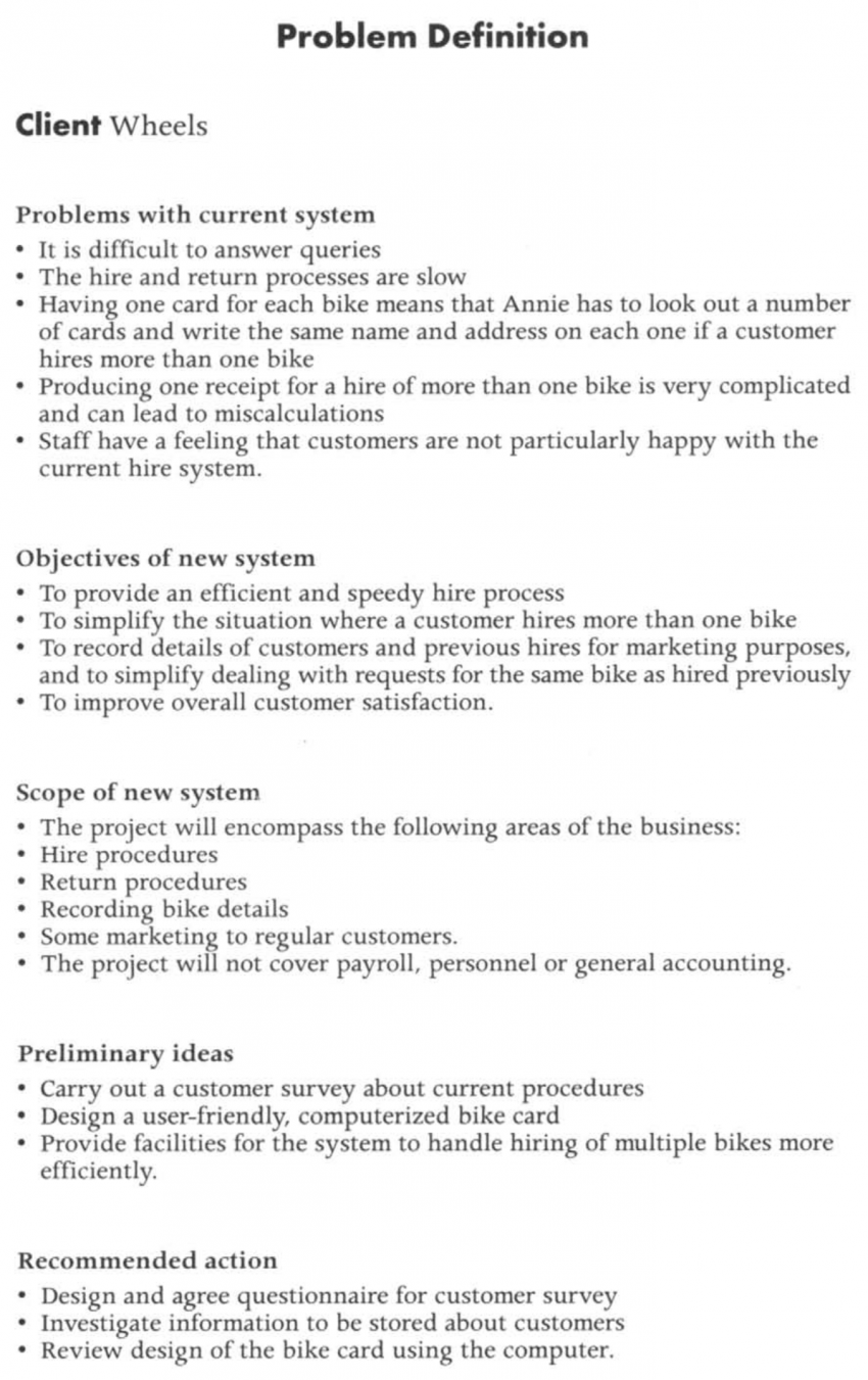 It also emerges from the interview that no record is kept of customer details or of what bikes they have hired on previous occasions. This sort of information would be useful for marketing purposes and to simplify dealing with requests for the same bike (see the Problem Definition (Figure 2.6), the Problems and Requirements List (Figure 2.7) and the Interview Summary (Figure 2.8)). Maintain customer list can therefore be identified as a use case.